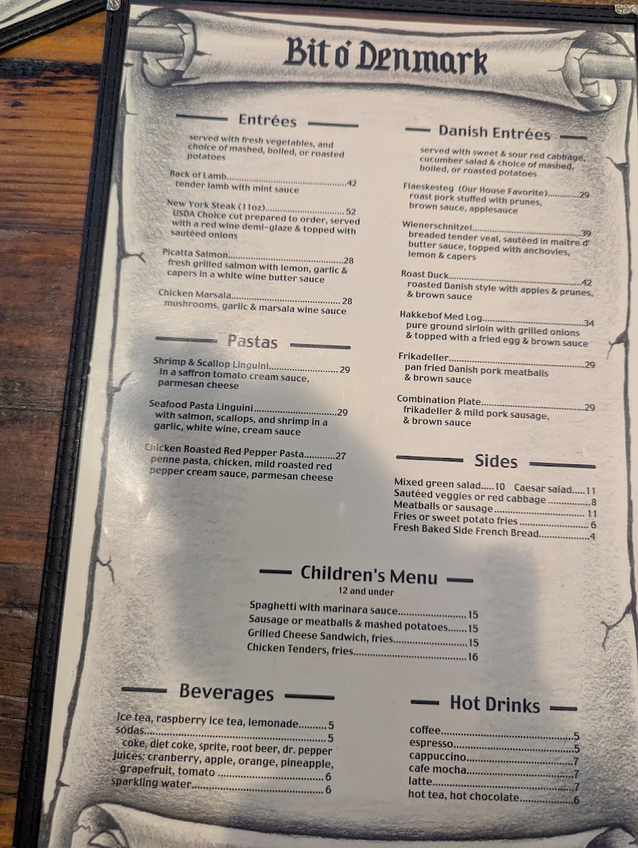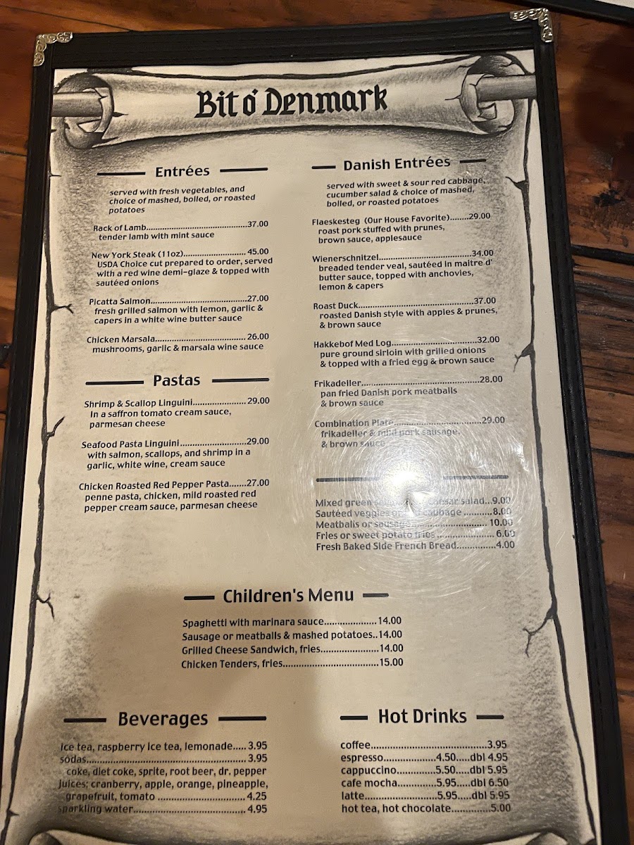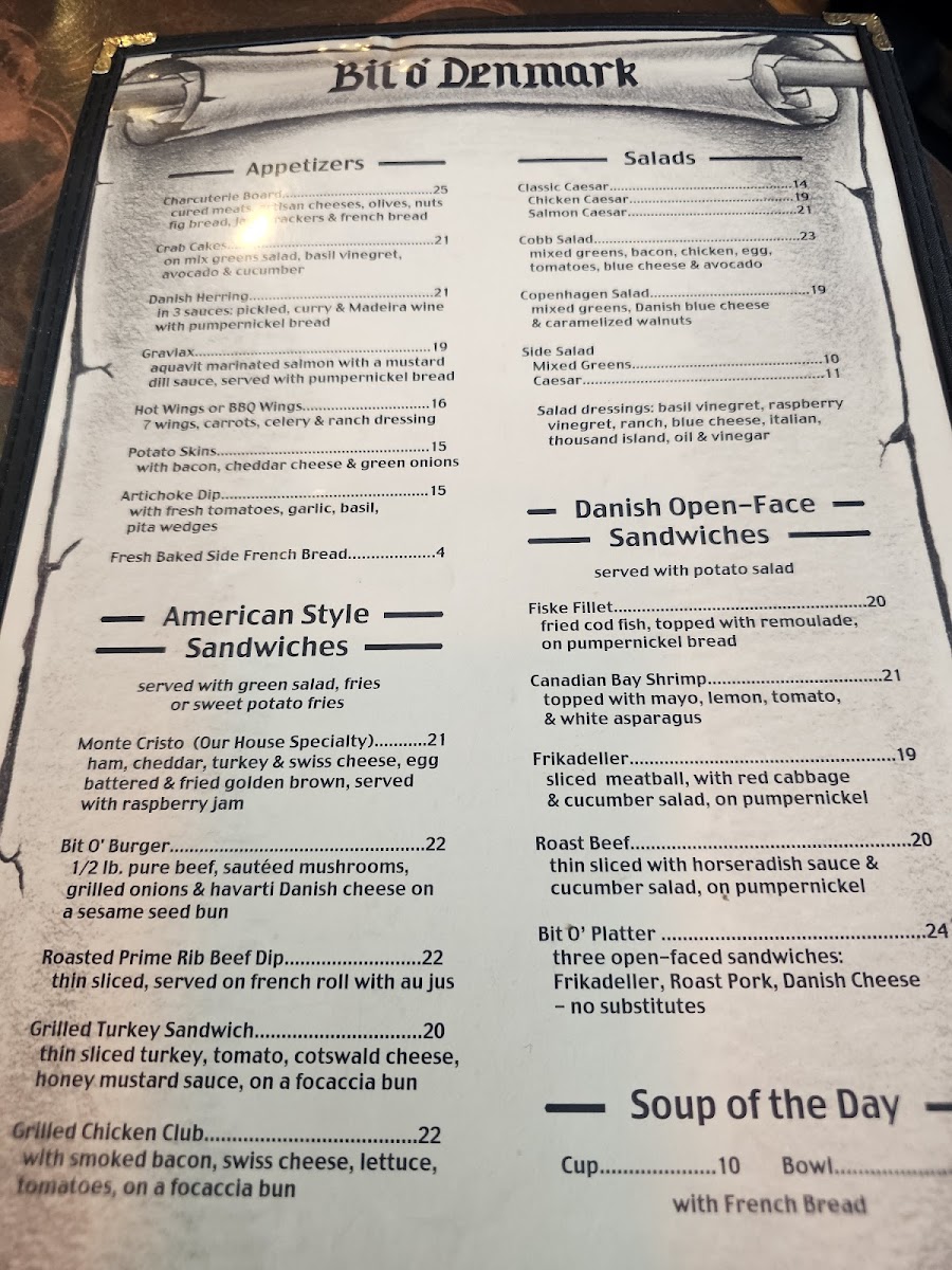 Welcome to Bit O'Denmark Restaurant, your gateway to a delightful culinary journey nestled in the heart of Solvang! Our menu is a celebration of Danish-inspired cuisine, featuring an array of specialties crafted with love and fresh ingredients. Every dish tells a story, from the irresistible Combination Plate that brings together diverse flavors to the legendary Monte Cristo Sandwich that's a must-try for any sandwich lover. Indulge in our Charcuterie Board, a perfect starter for sharing, or savor the delicate Fiske Fillet for seafood delights. Our fan-favorite Crab Cake and hearty Lamb Rack are sure to impress, while our refreshing salads, including the Cobb Salad and Caesar Salad, provide a lighter touch. Don't miss the Canadian Bay Shrimp Danish Open-Face Sandwich, a true treat for your taste buds! Pair your meal with a Belgian Hoegaarden Beer or explore our delightful Seafood Pasta. We invite you to join us at 473 Alisal Rd, Solvang, CA 93463, and experience the enchanting flavors of our Bit O'Denmark Restaurant Menu – where every bite is a celebration!