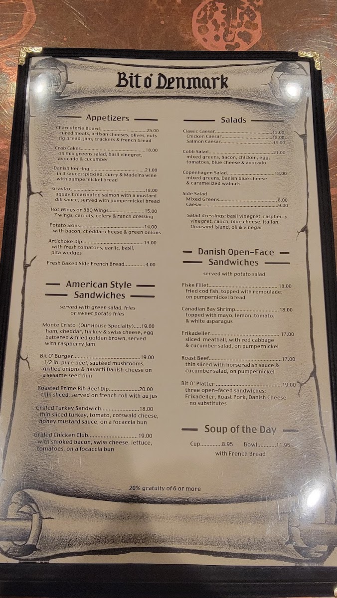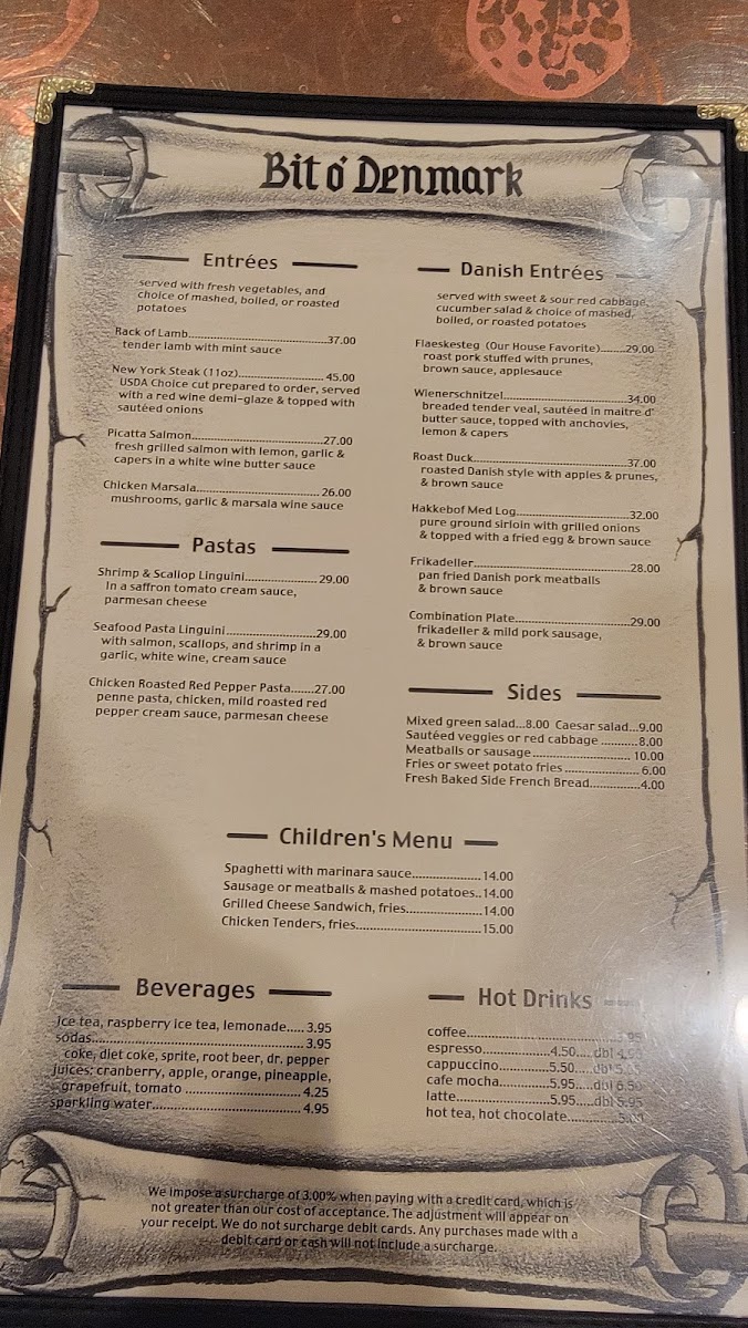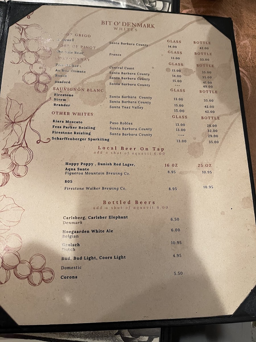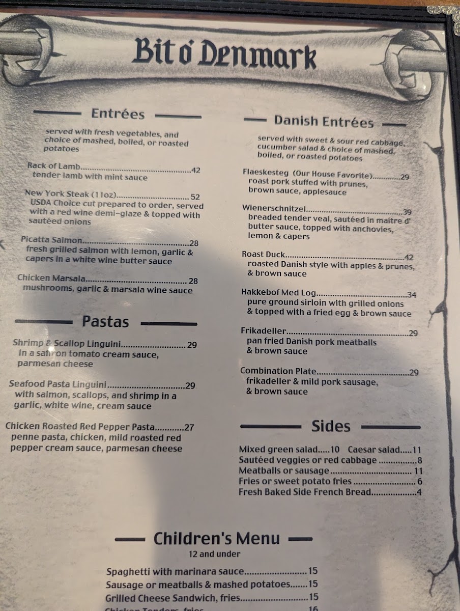 Welcome to Bit O'Denmark Restaurant, your gateway to a delightful culinary journey nestled in the heart of Solvang! Our menu is a celebration of Danish-inspired cuisine, featuring an array of specialties crafted with love and fresh ingredients. Every dish tells a story, from the irresistible Combination Plate that brings together diverse flavors to the legendary Monte Cristo Sandwich that's a must-try for any sandwich lover. Indulge in our Charcuterie Board, a perfect starter for sharing, or savor the delicate Fiske Fillet for seafood delights. Our fan-favorite Crab Cake and hearty Lamb Rack are sure to impress, while our refreshing salads, including the Cobb Salad and Caesar Salad, provide a lighter touch. Don't miss the Canadian Bay Shrimp Danish Open-Face Sandwich, a true treat for your taste buds! Pair your meal with a Belgian Hoegaarden Beer or explore our delightful Seafood Pasta. We invite you to join us at 473 Alisal Rd, Solvang, CA 93463, and experience the enchanting flavors of our Bit O'Denmark Restaurant Menu – where every bite is a celebration!